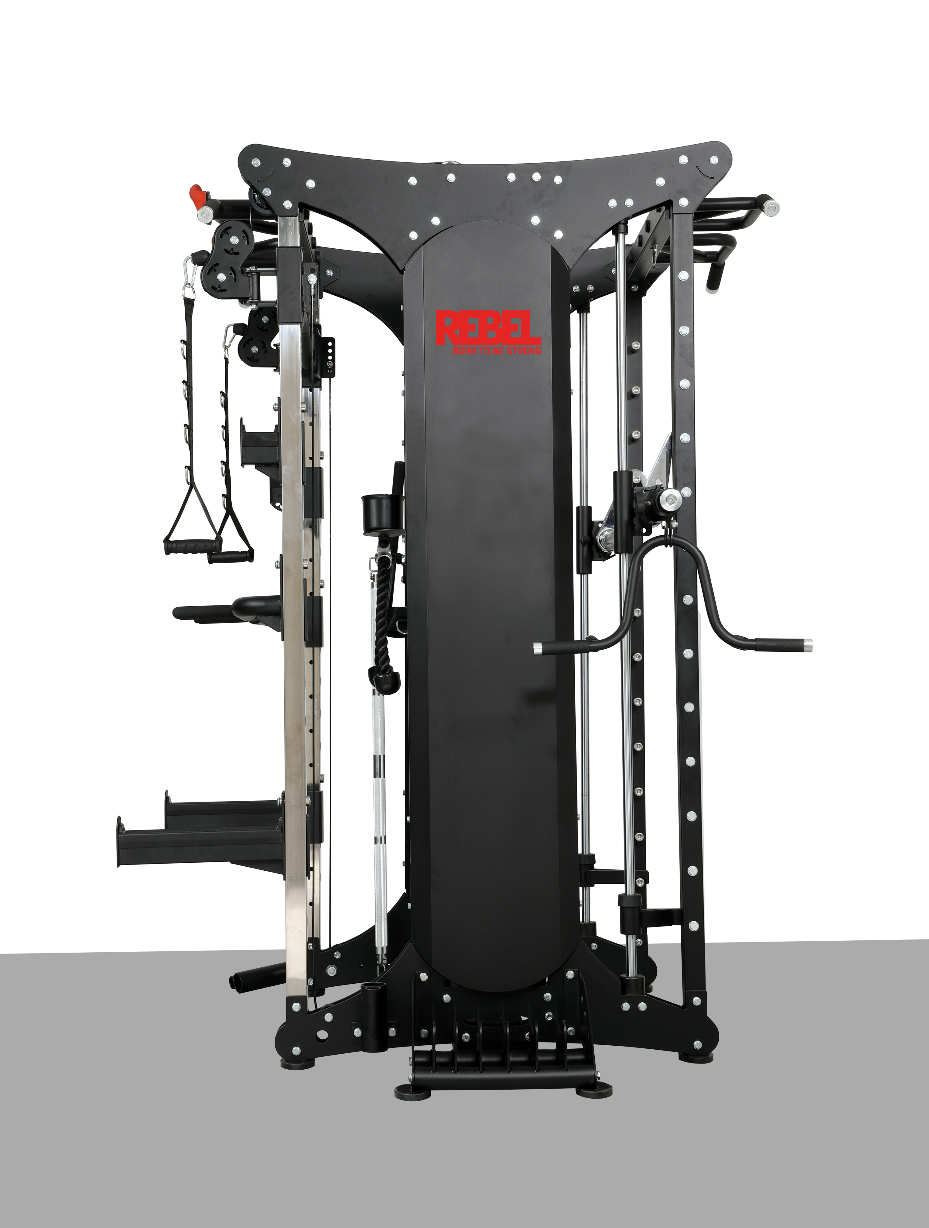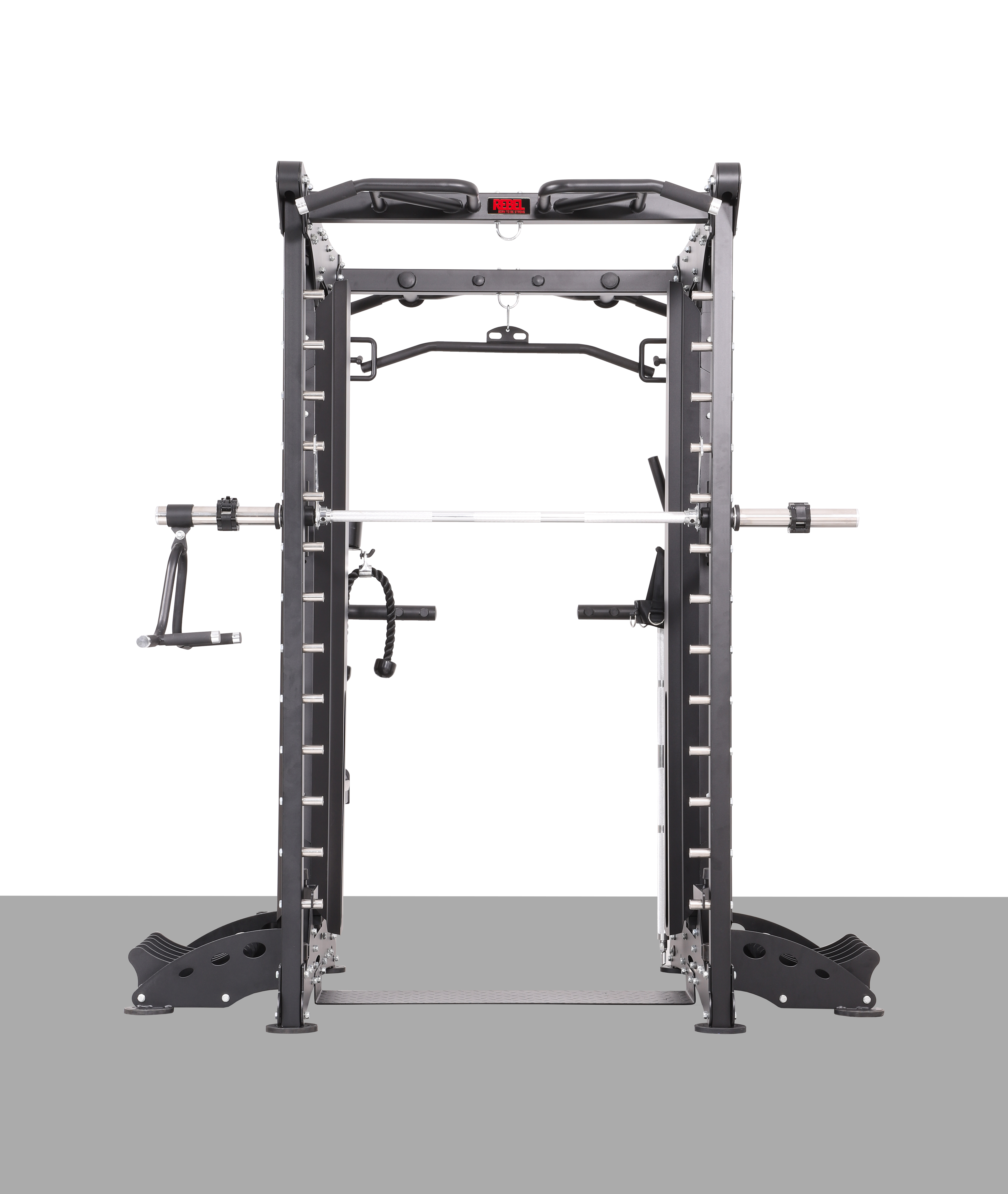 На силовой раме тренировочного комплекса REBEL RDT803-90 расположены две пары перемещаемых по высоте страховочных захватов разной длины для работы с независимым грифом.